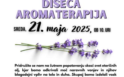 Prihodnji teden bo dišalo po različnih naravnih aromah. V sredo, 21. maja ob 10h, v goste pride Irma Dolinar, ki nam bo predstavila za kaj vse so pomembne vonjave in kako vplivajo na nas. Skupaj boste izdelali tudi svojo naravno dišavo. Mladinski oddelek knjižnice Ivana Tavčarj...