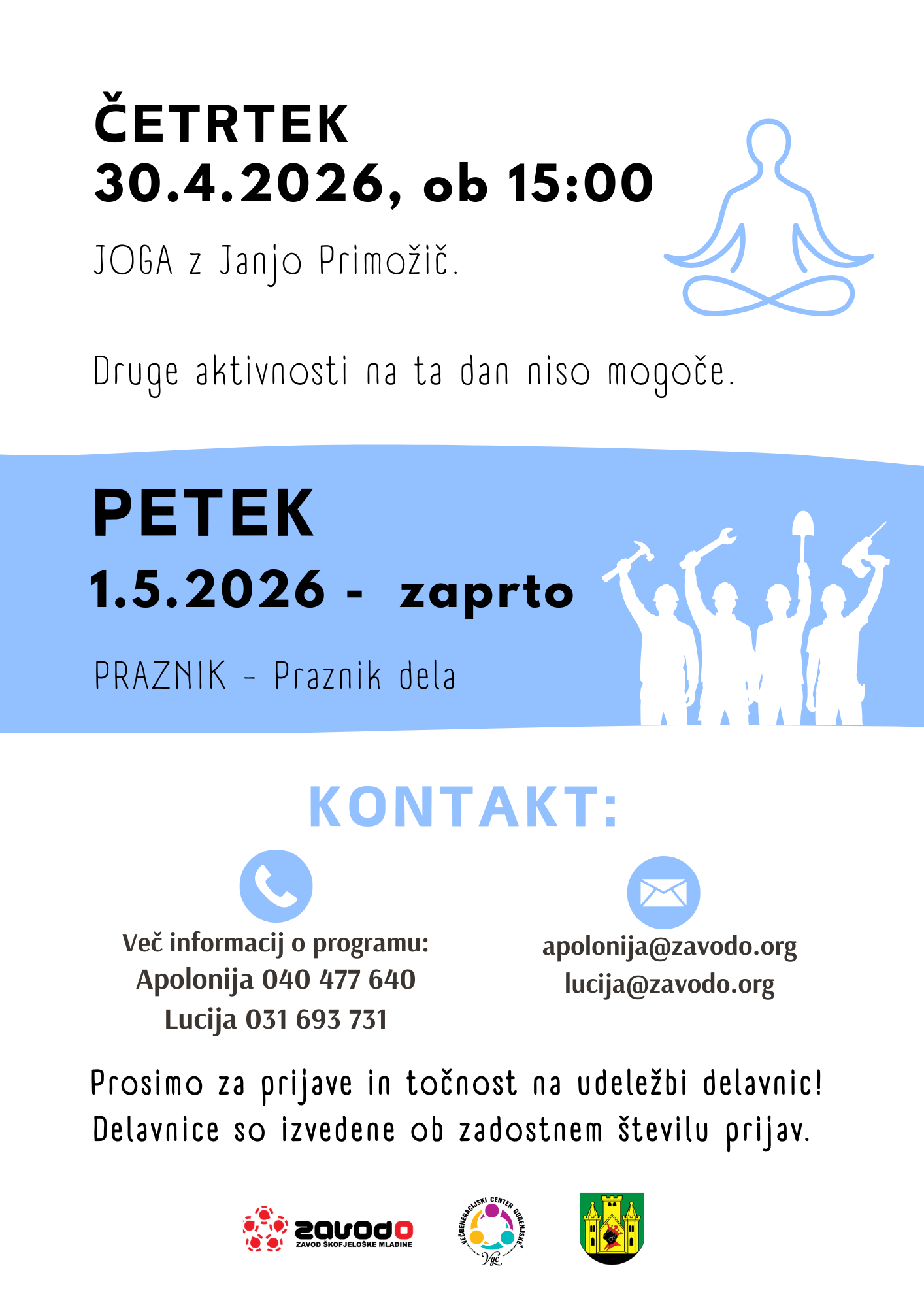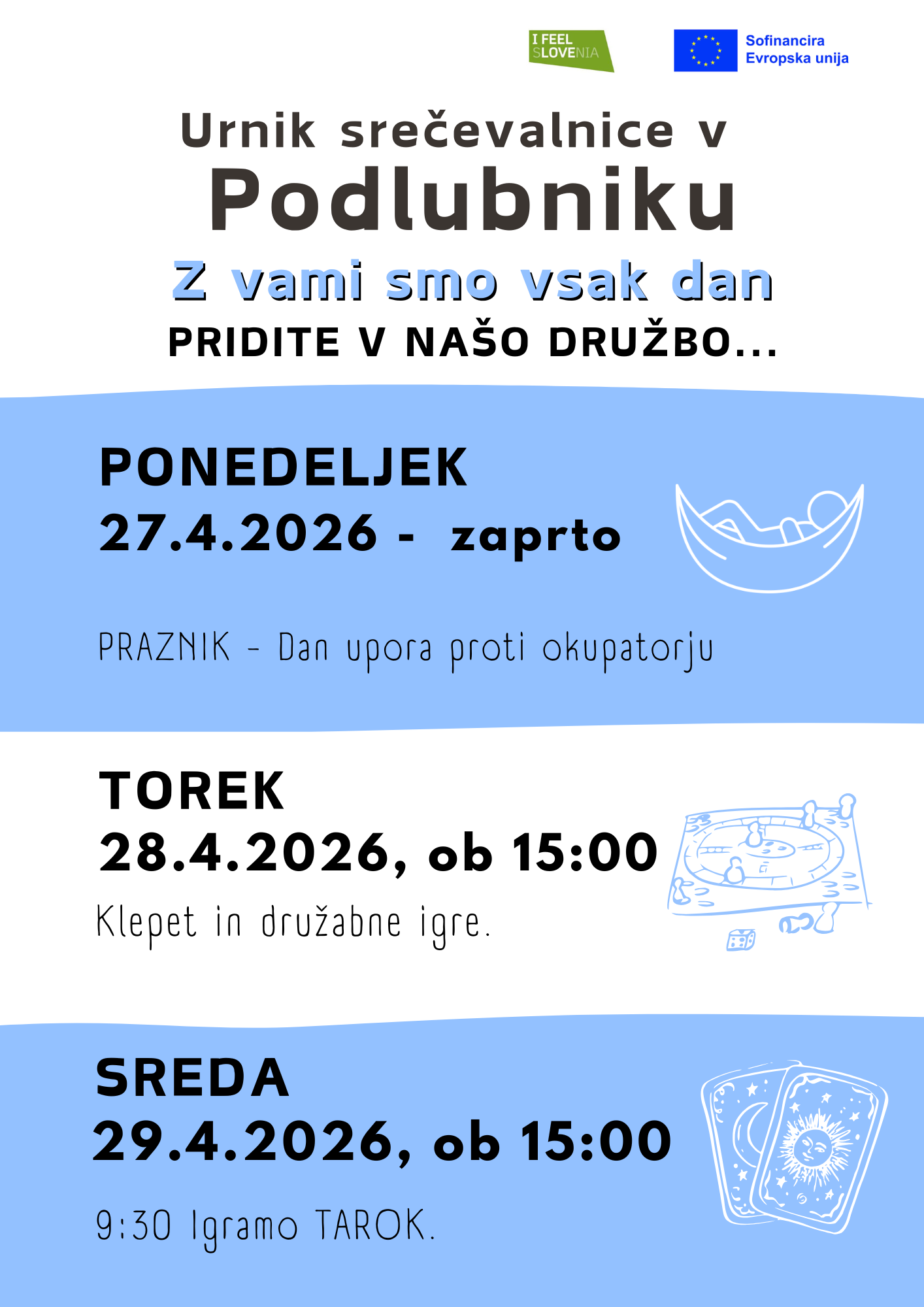 Konec aprila bomo prav tako preživeli v Srečevalnici Podlubnik. Povabljeni k druženju, klepetu in na jogo.